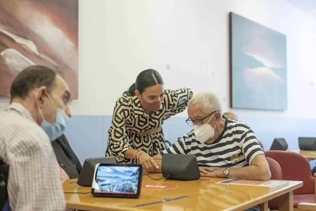 Los voluntarios de BBVA enseñan habilidades tecnológicas a mayores de residencias, ayudando a reducir la brecha digital gracias a nuestro programa “Abuelos Hackers”.